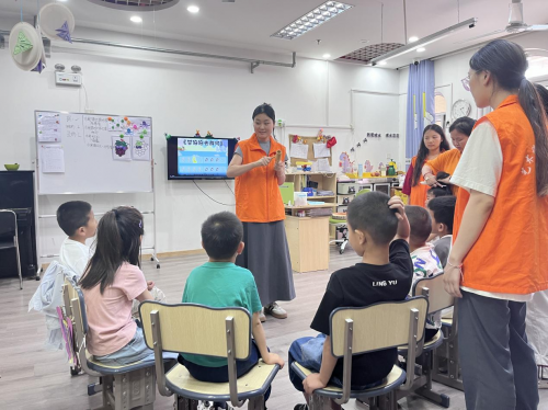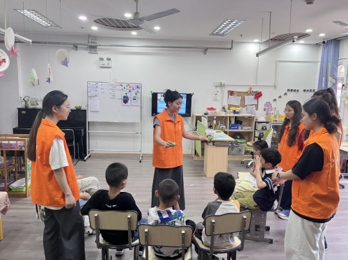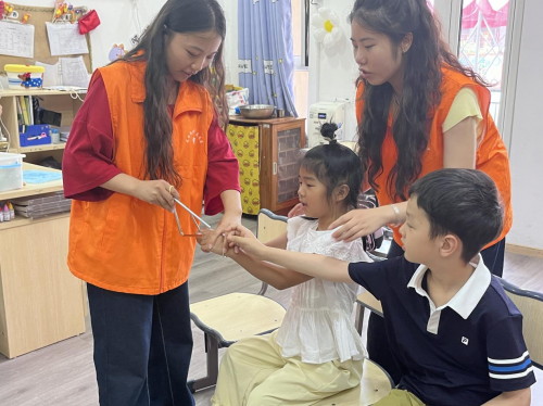为深入实施新时代立德树人工程,引导青年学子在社会课堂中“受教育、长才干、作贡献”,同时加强对特殊儿童群体的艺术关怀与心灵陪伴,7 月 8 日,南通职业大学艺术设计学院 “艺愈童心”社会服务实践团志愿者们走进博园岚郡幼儿园,为特殊儿童带来一场别开生面的音乐课,以爱为弦,奏响童真乐章。 课堂上,志愿者张子墨手持响板、沙锤等多种乐器,用清脆的敲击声瞬间抓住孩子们的目光。通过生动提问引导互动,孩子们将沙锤比作风吹树叶,把响板联想成马蹄声,奇思妙想让教室充满欢笑。 在体验环节,孩子们亲手触摸乐器,尝试创造独特声响。随后的节奏训练中,志愿者将孩子分成三组,配合视频和音频教学。从最初的节奏混乱,到在耐心指导下整齐敲击,孩子们逐步掌握技巧。 最终,在志愿者的带领下,孩子们成功合奏《森林狂想曲》。欢快的乐声与童真的笑声交织,每个人脸上都绽放出幸福笑容。 活动结束后,“艺愈童心” 团队的志愿者们也纷纷表示,此次暑期社会实践活动让他们在服务特殊儿童的过程中深刻体会到了青年学生的社会责任感,也让更多的特殊儿童感受到艺术的魅力和社会的关爱。(文:张雨佳 殷笑纳 图:邱文文 ) |