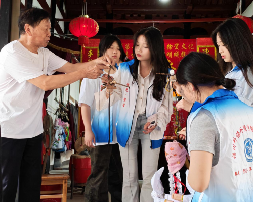 2025年8月28日,福州外语外贸学院金融学院“微光繁星”文化传承文明实践团走进福清市词明线戏苍霞村非遗传习所,以“非遗寻偶・青春传韵”为主题,开展了一场沉浸式的非遗文化探访活动。 成员们以“听、看、学、谈”四重体验,沉浸式解锁木偶戏的艺术密码,感知木偶戏的艺术魅力与人文温度,用青年视角记录非遗魅力,为古老艺术的当代传承注入鲜活青春动能。 一、听史之约:溯偶韵脉络,悟戏魂基因 活动刚启,传承人陈松生老师带领我们从屋前的门楣开始参观,从宋代李嵩《骷髅幻戏图》里的提线钩牌讲起,揭秘词明线戏的 “独特基因”:“咱们词明线戏,最早记载起源于宋朝李嵩……。”他从木偶戏依附民间婚丧嫁娶、节庆庙会的起源讲起,聊到明清时期 “唱腔随方言变,技法逐地域新” 的风格演变,再到如今入选非遗后“进校园、进社区”的保护新路径,老师的讲解深入浅出、脉络清晰,使成员们对这项古老艺术的发展历程有了整体把握,也为后续的实践体验奠定了认知基础。 二、观物之悟:赏匠心遗珍,触传承温度 在陈老师的指引下,实践团走进传习所的 “木偶陈列区”。展柜上,几尊传统木偶静静伫立:有的衣袂绣着精致的云纹,颜料虽有些许褪色,却依旧能看出当年的金线勾勒;有的面部雕刻细腻,眉眼间藏着“喜怒哀乐”的细微表情。 我们近距离观赏了珍贵的传统木偶、泛黄的剧本手稿以及摆放整齐的木偶制作工具台。随后,大家跟着老师走进后台。昏暗的空间里,线轴排列得整整齐齐,每根线都对应着木偶的关节,这些真实的物件与场景,像一本 “立体的非遗说明书”,让成员们直观看到木偶戏从 “木石成偶” 到 “登台亮相” 的完整流程,也深深触摸到背后代代匠人 “择一事、终一生” 的坚守。 三、习艺之趣:探牵丝诀窍,品戏台神韵 “提线要‘轻提慢抖。”陈老师登台演示,十余条线牵起木偶,转身、踱步、拂袖,竟有 “顾盼生姿似真人”的气韵——这正是词明线戏“线路少,操作明”的魅力。 成员们接过线杆,初时线绳缠作乱麻,木偶 “东倒西歪”;经老师手把手纠正 “拇指控主线,指尖分支线”,有人终于让木偶 “抬手迎客”,有人成功演绎 “躬身作揖”。在实操中感受“以线驭偶、以偶叙情”的技艺难度与表演乐趣。 互动环节结束后,老师与其团队更献上一段经典木偶戏表演,情节动人、技艺精湛,提线木偶与锣鼓声交融,生动诠释了“以木偶为媒介,以歌舞演故事”。传习所内掌声雷动,青春目光里,非遗不再遥远,而是可触可感的艺术脉动。 四、对谈之思:话传承新篇,凝青春担当 表演落幕,实践团围坐传习所,与陈老师展开 “代际对话”: 成员围坐聆听时,老师指着墙上的省级非遗牌匾:“我 7 岁就蹲在父亲的戏台边看,15 岁第一次登台演小角色。” 谈及往事,他眼中闪着光,“文革时只能演《红灯记》这些样板戏,传统戏目差点就断了根。”这场交织着历史厚度与个人记忆的 “非遗课”,让大家对这项延续四百余年的艺术有了立体认知。 谈及传承,老师的语气格外坚定:“49 岁退休后我就专心教戏,只要还有人学,这门手艺就断不了。”夕阳透过雕花窗棂,将大家与木偶的身影投在墙上。 访谈结束,成员们陈老师、他的弟子一起站在戏台前合影。陈老师站在成员中间,成员们笑着比出 “赞” 的手势,相机 “咔嚓” 一声,定格下这场 “青春与非遗的相遇”。 归途上,成员们手中仍带着樟木清香。这场探访不仅解码了词明线戏 “竹竿牵丝演春秋” 的独特魅力,更让青春力量与非遗传承有了温暖的交集。未来,这些 “木偶故事” 将通过新媒体飞向更远的地方,让丝牵古韵在新时代焕发新生,让文化血脉在青年接续中生生不息。(作者:纪光宏,陈韵柔) |