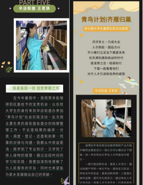 南师学子返家乡,青春实践向基层 今年暑假期间,来自南京师范大学文学院的王茗琪同学积极响应“返家乡”的号召,报名参加了本校的暑期社会实践活动。七月初,她回到了家乡山东省淄博市临淄区,报名并成功入选了2025年淄博市大学生暑期社会实践活动,在临淄区民政局挂职锻炼,进行了长达一个月的社会实践。 来到民政局后,王茗琪根据单位安排进入社会组织管理科实习,主要负责社会组织档案整理工作。到岗的第一天,她就积极投入到了档案整理的工作中,一头扎进档案室,潜心对档案进行分类与归置。初入科室进行实践时,她对档案整理的工作流程还不甚熟悉,但她始终认真反思自己的不足,并向领导和同事积极请教,不断完善自身的工作,也使后续的工作得到了更加顺利的开展。 作为中文系的学生,王茗琪曾系统学习过“中文工具书与文献检索”课程,拥有扎实的专业功底,也参加过南京市档案馆的志愿服务工作,因此,在档案整理方面,她本身就具有一定的基础。经过单位的系统培训和她本人的虚心请教,王茗琪很快就掌握了档案整理的方法,并与同事协作配合,出色地完成了以社会组织管理科为主的多个科室的多项档案工作。 整理档案要的是“绣花功夫”,唯有认真细致,方可不出差错。编号、粘贴标签、换档案盒、文件分类与归纳、重命名、排序、搬运……每一项都要细心去做,不能马虎。在多次学习和实践后,王茗琪已经对这些步骤了然于心,也正因此,她与同事实现了良好的合作,并最终得以高效地完成了档案整理工作。除实际的整理工作外,她还与同事一起采用标准化格式,分门别类地对档案进行归整,按委办类别建立了高效的电子化索引表格,清楚地标明了档案日期、盒号件号等信息,并及时地进行检查与更新。 在进行室内工作的同时,王茗琪也常常走出办公室,参加志愿服务活动。她主动请缨,在整理档案之余为前来办事的群众提供索引指导。此外,她也时常跟随单位人员实地走访,探望了多户退役老兵、困难群众、失独家庭和残障人士,为居民们送上了街道的福利礼品。她下基层,走街巷,倾听群众心声,关心居民生活,换来了居民的一张张笑脸。 在档案整理之外,王茗琪还参加了团区委组织的多项活动,从这些活动中,王茗琪一方面对自己的职业规划有了更清晰的认知,一方面也实实在在地深入到了社区建设一线,对基层治理有了更深的思考。 半个多月来,王茗琪的身影活跃在档案室的角角落落,活跃在基层社会治理的方方面面。她和其他的同事一起,构成了临淄区民政局一道年轻靓丽的风景线。她以自身认真踏实的工作、一丝不苟的态度、谦让亲和的姿态,赢得了单位领导和工作人员的认可,也赢得了居民的一致好评。 一个暑假积极认真的实践参与为王茗琪带来了丰硕的实践成果。她的实践感悟和对家乡人才发展的建议先后发表在了共青团临淄区委的公众号“青春临淄”上,让更多人听到了她的声音。在临淄区暑期社会实践座谈会中,王茗琪荣幸地被选为发言代表,与区委领导面对面交流,相关建议也赢得了领导的认可与称赞。暑期社会实践活动结束之际,王茗琪也收获了三张证书:她不仅认真参与了本次实践,还被评为“优秀等次”,并成功当选了“‘齐雁归巢’高校青年人才联络员”。 通过这一段时间的虚心学习和认真实践,王茗琪进一步感悟到了志愿服务精神的内核,增强了服务人民、回报家乡的责任感和使命感,更加深刻地理解了中国共产党“全心全意为人民服务”的宗旨,并努力地向党组织靠拢。 王茗琪说,“感谢党组织和团组织的信任,感谢学校和家乡给我提供了这次宝贵的实践机会,让我得以踏上这场青春实践之旅,在基层一线服务人民群众,绽放青春光彩。”未来的日子里,王茗琪将更加积极地投身社会实践的广阔天地,在身体力行中弘扬奉献精神,传递青春正能量,不啻微茫,造炬成阳。 |
