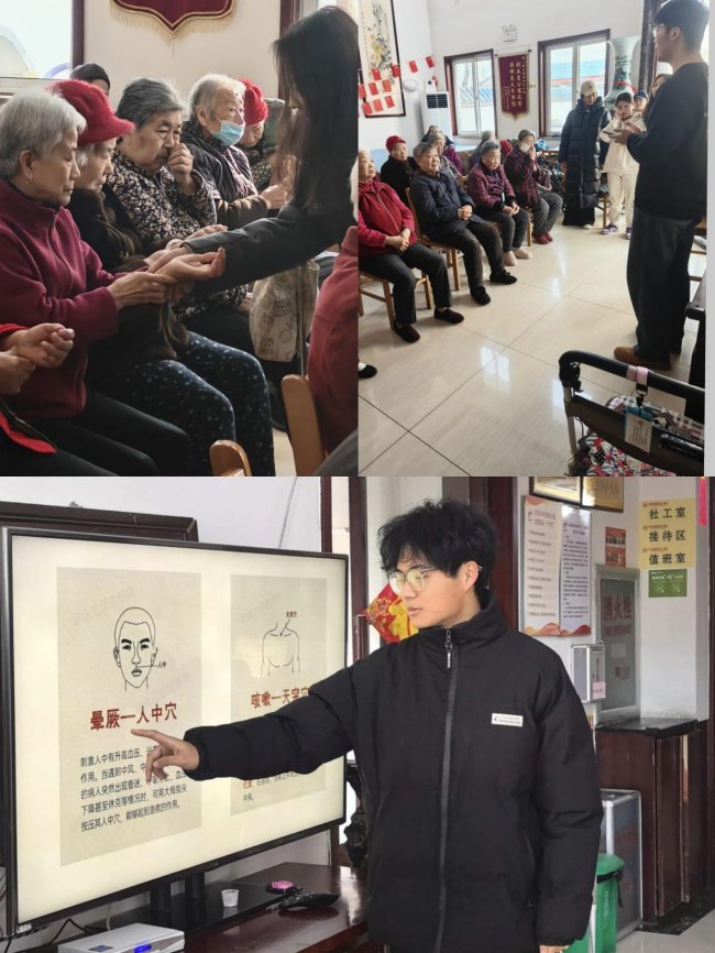 冬日的暖阳透过济南市绿苑福鼎老年公寓活动室的落地窗,洒下斑驳的光影。清晨八点半,平日里安静的活动室今天却热闹非凡——山东中医药大学泉城共践队的年轻志愿者正与十几位头发花白的老人并肩而立,随着舒缓的《太极韵律》音乐响起,一场别开生面的“太极养生课”拉开了序幕。 “爷爷奶奶,太极拳讲究‘心静体松’,咱们先从‘起势’开始,双手像捧着一团云一样慢慢抬起……”志愿者小刘站在队伍最前方,动作舒缓而有力。她一边示范,一边用生动的比喻引导老人们调整姿势。78岁的张奶奶是第一次学太极拳,起初有些拘谨,但在志愿者手把手的指导下,当她跟着音乐完成第一个“云手”动作时,脸上露出了惊喜的笑容:“这动作看着慢,做起来还真舒服,感觉胳膊上的筋都松开了!” 活动现场,十几位老人跟着志愿者的节奏,时而“白鹤亮翅”,时而“搂膝拗步”。虽然动作不如年轻人流畅,但老人们眼神专注,呼吸配合着动作,一招一式间竟也透着几分太极的韵味。82岁的王爷爷练完一套简化24式太极拳后,擦了擦额头的细汗,连声赞叹:“这拳好!冬天手脚容易凉,练完浑身热乎乎的,关节都灵活了!” 穴位里的“养生密码” 太极拳的热身让老人们的身体逐渐舒展,紧接着,志愿者小王带来了今天的“重头戏”——穴位养生知识小课堂。她拿出精心准备的黄金七星图和急救穴图,用通俗易懂的语言为老人们揭秘“穴位里的养生密码”。 第一个穴位是“足三里”。“这个穴位在膝盖外侧下方凹陷处下四指宽的位置,是调理脾胃的‘大穴’。”小陈一边讲解,一边走到80岁的李奶奶身边,轻轻握住她的手,帮她找准穴位位置,“每天早晚各按压3分钟,能促进消化,还能增强免疫力。”李奶奶闭着眼睛感受着穴位的酸胀感,连连点头:“怪不得我最近胃口不好,原来是有‘窍门’没找到!” 接着,小陈又教大家按压“涌泉穴”和“合谷穴”。“涌泉穴在脚底前1/3凹陷处,睡前用热水泡脚后按压,能引火归元,改善睡眠;合谷穴就是咱们常说的‘虎口’,感冒头疼时按一按,能缓解症状。”为了让老人们记住穴位位置,志愿者们还编了顺口溜:“足三里,胃气足;涌泉穴,睡得香;合谷穴,感冒跑……”老人们跟着念,现场笑声不断。 手手相传的“温暖接力” 活动室里,暖意融融。志愿者们的手与老人们布满皱纹的手交叠在一起,穴位的按压声、老人的笑声、志愿者的讲解声交织成一首温暖的乐章。76岁的陈奶奶拉着志愿者的手说:“你们不仅教我们打拳、按穴位,还陪我们说话,比自家孩子还贴心!” 传承与守护的双向奔赴 志愿者同学在活动总结中写道:“以前觉得养生是‘玄学’,今天看到爷爷奶奶们因为一个穴位缓解了疼痛,因为一套拳法露出了笑容,我才明白,传承传统文化最好的方式,就是让它真正服务于人。” 尾声:让温暖在指尖传递 此外为丰富老年人的精神文化生活,营造欢乐和谐的养老氛围,团队还在济南市绿苑福鼎老年公寓组织开展了一场别开生面的“乐享银龄”主题文娱活动,与老人们共度温馨时光。 冬日的寒风依旧凛冽,但绿苑福鼎老年公寓里,温暖却在指尖传递。这场以“太极+穴位”为主题的实践活动,不仅是一次养生知识的普及,更是一场跨越年龄的温暖邂逅。它让老人们在锻炼中收获健康,在互动中感受关爱,也让青年志愿者在服务中读懂了“尊老敬老”的真谛。(作者:王佳乐 孙梓涵 刘宇欣) |